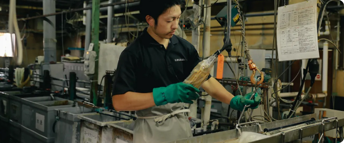 無電解ニッケルめっきは通称カニゼンめっきと呼ばれ、電気を使わないめっき方法です。めっき後に熱処理をおこなうことにより、非常に硬い膜を形成することができます。また、穴の深奥など、電気めっきでは付き難い箇所にもめっき液に接触していればめっきされるので、複雑な形状の製品にも適しています。
