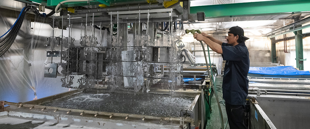 カチオン電着塗装とは被塗装物を電着塗料中に浸漬して、被塗装物を陰極(マイナス)、電着槽内の隔膜室内に設置した極板を陽極(プラス) として、この間に100~200Vの直流電流を流し、水中に分散している塗料の微粒子が電気的な力によって(電気泳動)、被塗装物に引き付けられ、凝集析出します。