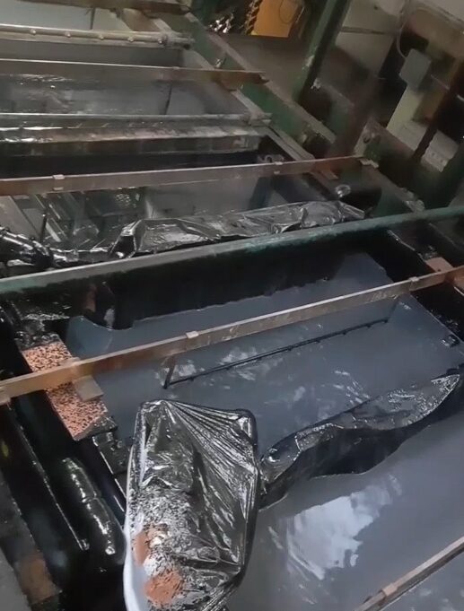 この水槽の脇にある電極からバー、ハンガーを伝い製品へ電気を流すと、このさらさらの液中の塗料分が製品に電気的な力でくっつくっていう