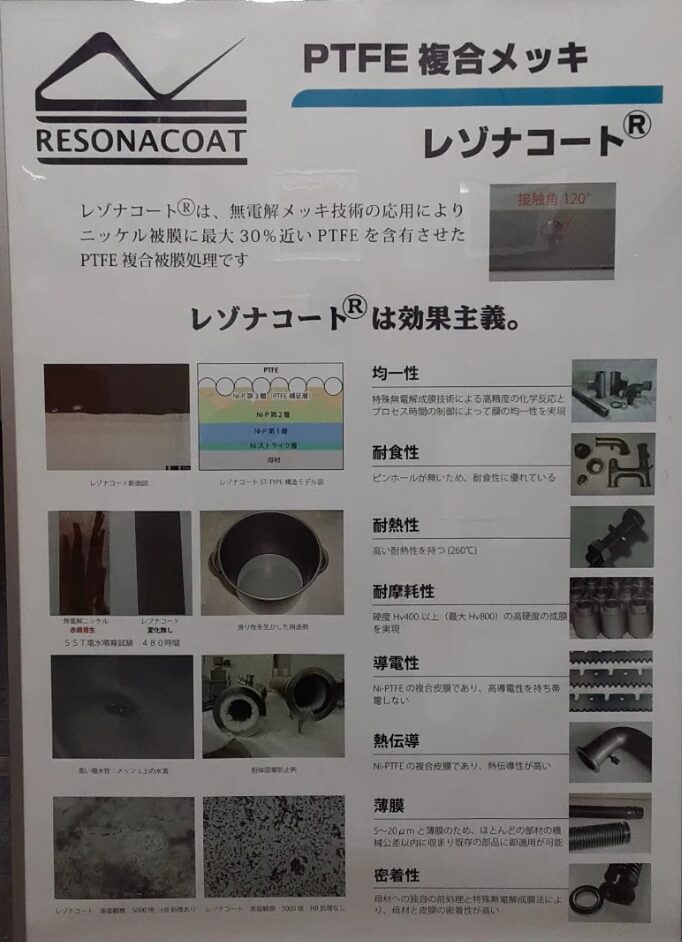 PTFE(テフロン)粒子を無電解ニッケルめっきに混ぜ込んだ無電解ニッケルテフロンめっきというもので藤間精練では登録商標を持っています。